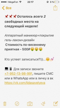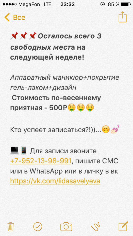 Девочки, каждый раз перед записью (ориентировочно за сутки!!!) я отправляю вам так называемую СМС-напоминалку. До вечера того дня, когда было отправлено СМС, я жду от вас подтверждения о том, что вы приедете. Отправить подтверждение Вы можете любым способом - хоть ответом на СМС, хоть звонком, хоть сообщением в ЛС или в WhatsApp...Вообщем, хоть как) А теперь о не совсем приятном... Без подтверждения я могу на ваше место записать другого человека или вовсе заняться своими делами) Прошу понимания и без обид)))