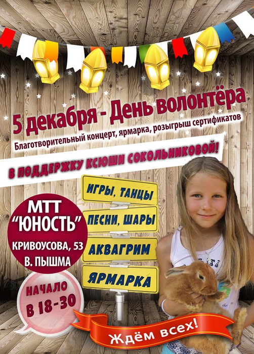 ПРАЗДНИК в помощь Ксюше состоится 5 декабря ВТ. по адресу:г. В. Пышма, ул. Кривоусова, 53 ( Техникум "Юность" бывшее ГПТУ -90) .