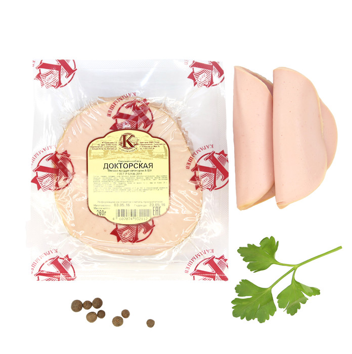 Докторская и любитльская в натуральной оболочке, можно купить порционно 260г, можно целым батоном, батон вытягивает в среднем на 2 кг.