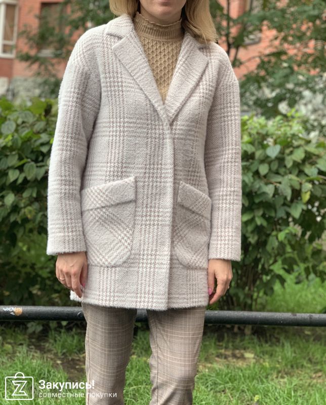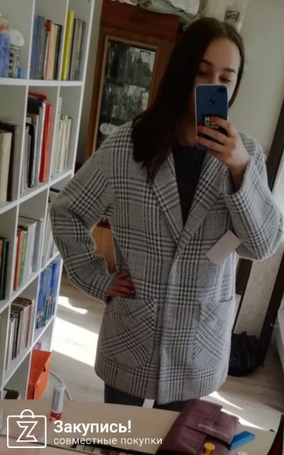Получили серое пальто в клетку. Образец ткани сфотографировала поближе, ткань не плохая, ворсованая. По размеру оно оверсайз. Брали 46 размер, можно было и 44 взять. Пальто на тёплую погоду, не толстое, сейчас в нем холодно будет или свитер вниз одевать.