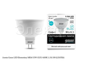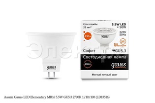 Лампа Gauss LED Elementary MR16 5.5W GU5.3 3000К 1/10/100 (13516)