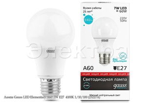 Лампа Gauss LED Elementary A60 7W Е27 4100K 1/10/100 (23227А)