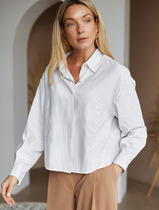 Блузка классического прямого кроя с длинными рукавами на манжетах и застежкой на планку с пуговицами.