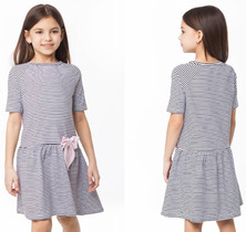 Платье полуприлегающего силуэта выполнено из эластичного хлопкового трикотажа. Заниженная талия декорирована контрастным бантом.