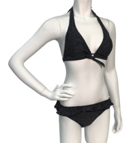 Черный купальник в мелкий белый горох с воланом на плавках