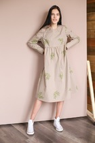 Свободное платье oversize. В боковых швах карманы. Длина рукава по задумке чуть короче стандартной. Параметры: длина рукава от плеча - 57 см, длина изделия по спинке - 101 см. Платье имеет нежный серо-бежевый оттенок, дополненный ручным рисунком в виде веточек оливок.