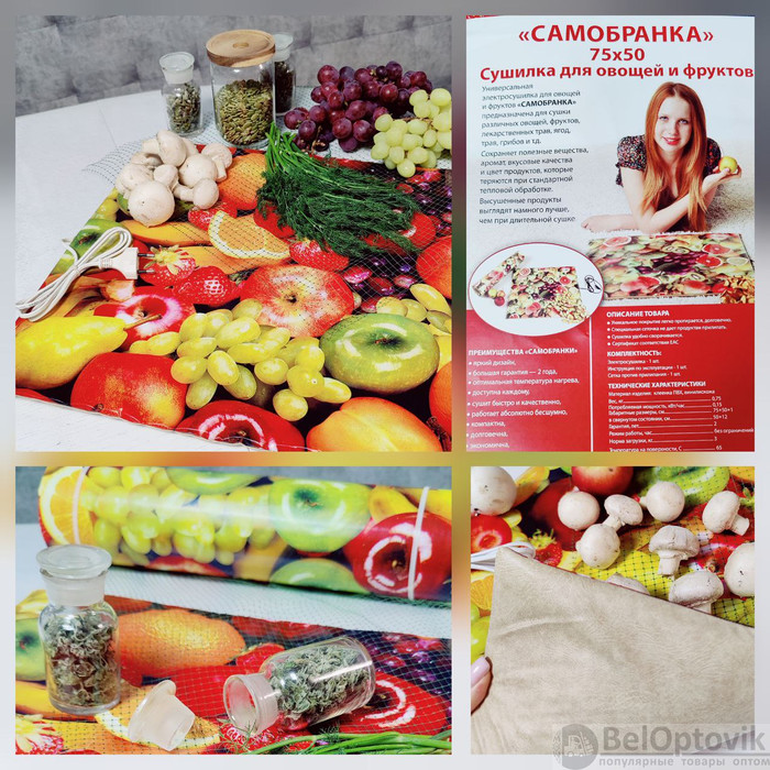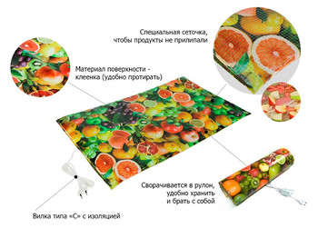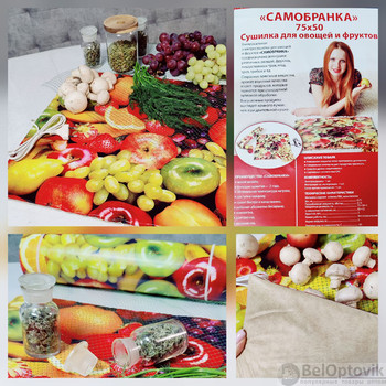 Предназначена "Самобранка" для сушки любых видов урожая – фруктов, овощей, ягод, трав, кореньев и корнеплодов. А также рыбы, грибов, домашней лапши, пастилы, сухариков и вообще всего, что нужно высушить самым экономичным способом.