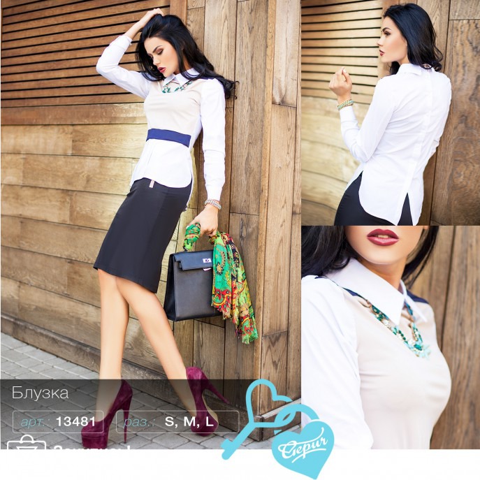 Блузку заказывала в размере М, на мой 44 подошла идеально. Всё как на картинке кроме тёмных деталей, на моей блузке они выполнены из чёрной ткани. Сама рубашка из тянущегося \"стрейчевого хлопка\", вставки синтетика. Смотрится здорово и с юбкой-карандаш и с пышными юбками с завышенной талией.