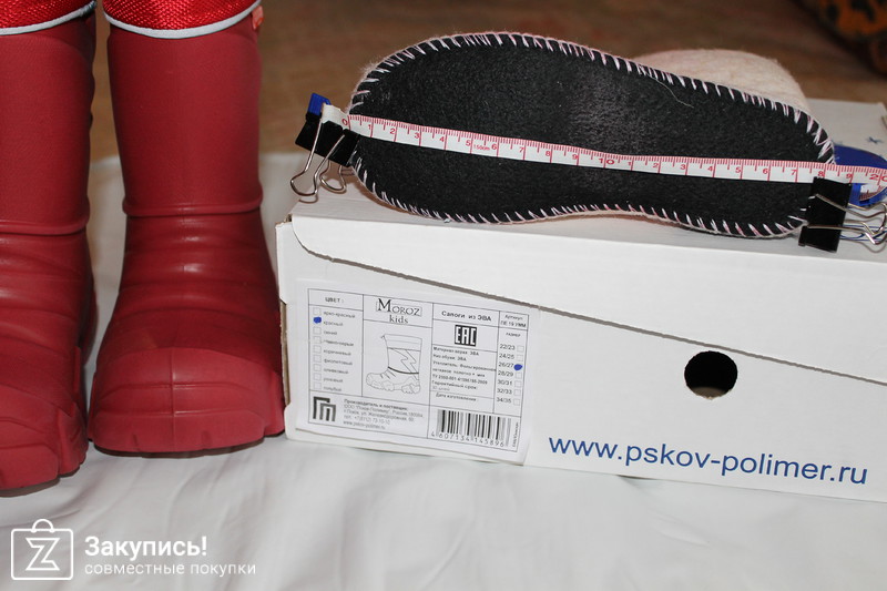По размерам: Детские сапоги из ЭВА ПЕ-4 УТМ– с вкладышем 31-32 размер - 21 см стелька вкладыша и 22 см стелька самого сапожка.