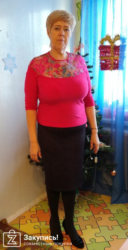 Параметры 167, ОГ 96, ОБ 101, брала размер 48. Верх -только-только, плечи на месте, грудь -тоже, в бёдрах -свободнее, но это хорошо, так и должно быть, поскольку пришивная юбка прямого кроя. Трикотаж приятный, однотонный-в рубчик, правда думаю, что зацепки будут. Немного липнет к ногам, поскольку нет подклада, но это решаемый вопрос . Длина до середины колена, поэтому высокорослым дамам среднего возраста, пожалуй, будет коротко. Но на меня село очень хорошо. Цвет понравился, ткань тоже. Буду носить на работу с превиликимудовольствием!!!