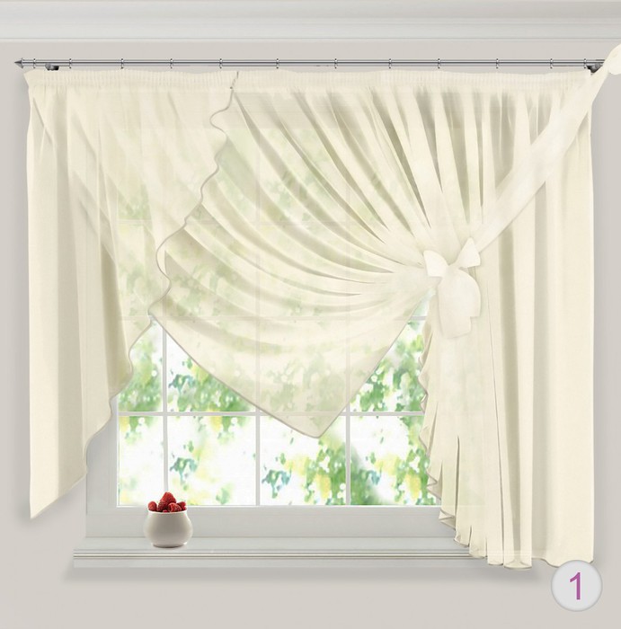 Занавеска из мягкой вуали средней прозрачности. состоит из 2-х частей, пришитых на одну шторную ленту. Украшена атласной бейкой в тон швета шторы. 100% полиэстер. светонепроницаемость -10-12%. Производство FIRANKA.