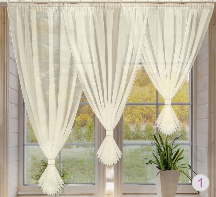 Занавеска из мягкой вуали средней прозрачности. состоит из 3 х частей, пришитых на одну шторную ленту. Украшена атласной бейкой в тон швета шторы. 100% полиэстер. светонепроницаемостьв собранном виде -12-15%. Подхваты крепятся сзади на кнопки. Размеры вариант 3 и 4: 250 см ширина х 160/140 см высота. Производство FIRANKA.