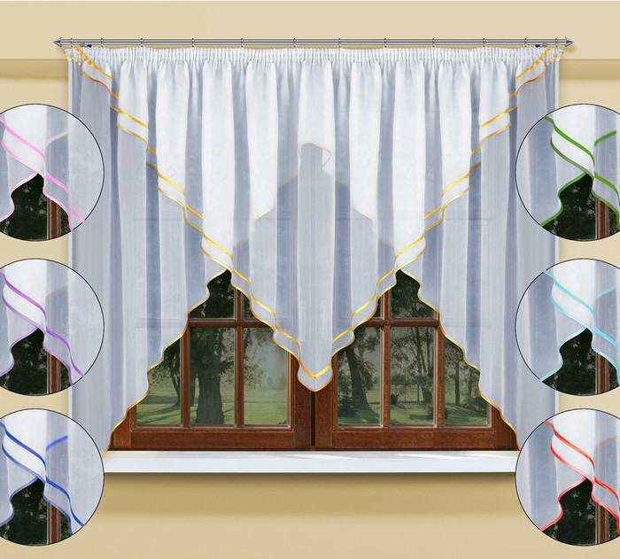 Занавеска из мягкой вуали средней прозрачности. состоит из 2-х частей, пришитых на одну шторную ленту. Украшена атласной бейкой. Возможны различные цветовые варианты декоративной бейки. Максимальная высота средней части - 150 см. 100% полиэстер. Светонепроницаемость -10-12%. Производство FIRANKA.