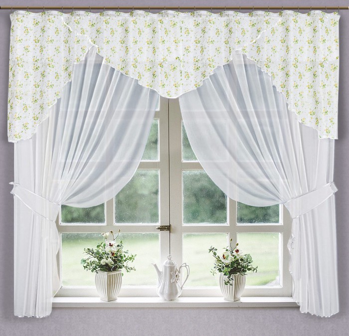 Комплект из мягкой вуали средней плотности, Размеры: ширина шторок - 150 см каждой, высота 180 см. Высота ламбрекена 70/50/70 см. Вес1 кг. Размер в упаковке (45*50*10 ) см. Светонепроницаемость - 10-12%. 100 % полиэстер. Производство FIRANKA.