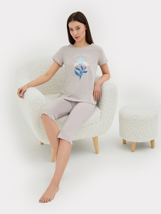 Прекрасный пижамный комплект из хлопка. Футболка прямая и свободная, с круглым вырезом и короткими рукавами с декоративным вырезом-капелькой. Бриджи длиной ниже колена, свободные. Стильная и удобная пижамка!