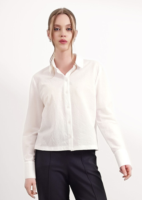 Блузка прямого силуэта из трикотажного полотна, с отложным воротником на стойке. Спереди цельнокроеная планка с застежкой на пуговицы. Длинный втачной рукав, внизу с притачной манжетой и застежкой на пуговицу. По спинке кокетка со складкой.