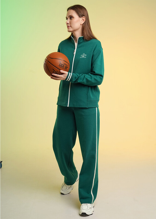Куртка спортивная из трикотажного полотна дабл фейс на молнии. По горловине стойка с кантом. Длинный рукав со спущенной линией плеча. По низу рукава вязаный манжет, по низу изделия манжет из основного полотна. Спереди рельеф с карманом в шве, принт.