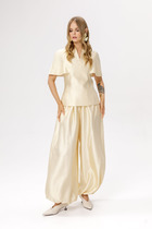 Брюки с посадкой на талии свободного силуэта. Пояс цельнокроеный с резиной внутри 40RV подвернутый внутрь. Низ изделия обработан швом в подгибку.