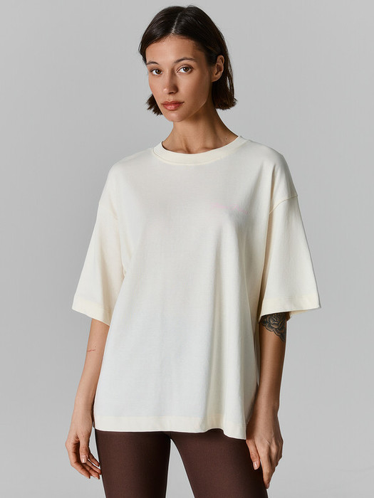 Горловина округлой формы обработана обтачкой из рибаны. Шов втачивания обтачки по спинке закрыт обтачкой из основного полотна. Рукава втачные, корткие. Линия плеча спущена. Нижние срезы футболки и рукавов обработаны швом вподгибку.