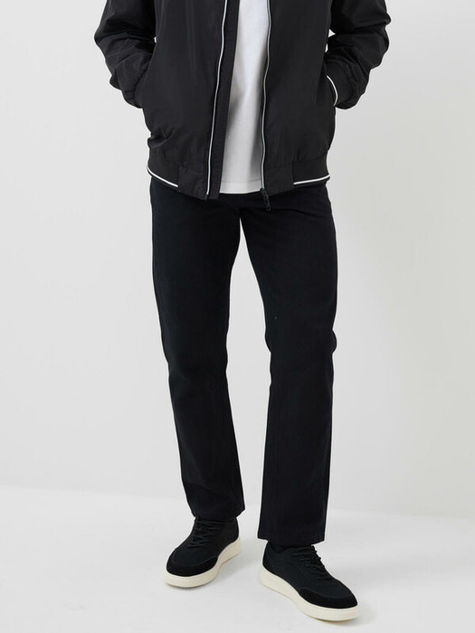 Классические мужские джинсы прямого кроя и средней посадки. Изделие выполнено из плотного черного денима. Застежка на молнию и болт. Пять карманов, включая маленький передний, шлевки для ремня. Сзади на поясе — контрастная нашивка с логотипом.