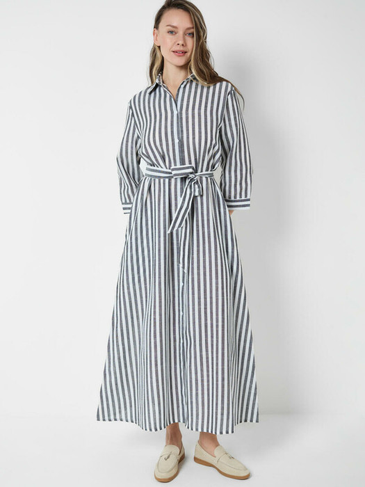 Женское платье в длине макси. Модель выполнена из хлопковой ткани, имеет прямой верх и расширенную к низу юбку, за счёт чего красиво смотрится в движении. Платье застёгивается на пуговицы. Линия талии подчёркивается съёмным поясом. Рукава длинные, с манжетами на пуговицах. По бокам предусмотрены удобные карманы. Воротник классический, отложной.