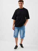 Мужские джинсовые шорты длиной чуть ниже колена. У шорт классическая посадка на талии, пояс с пятью шлёвками и застёжка на молнию и болт. Спереди — два классических кармана и маленький карман для мелочей, сзади — два накладных кармана. Также по бокам расположены объёмные карманы-карго. На поясе сзади пришита кожаная джинсовая нашивка с логотипом.