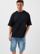 Мужские джинсовые шорты длиной чуть ниже колена. У шорт классическая посадка на талии, пояс с пятью шлёвками и застёжка на молнию и болт. Спереди — два классических кармана и маленький карман для мелочей, сзади — два накладных кармана. Также по бокам расположены объёмные карманы-карго. На поясе сзади пришита кожаная джинсовая нашивка с логотипом.