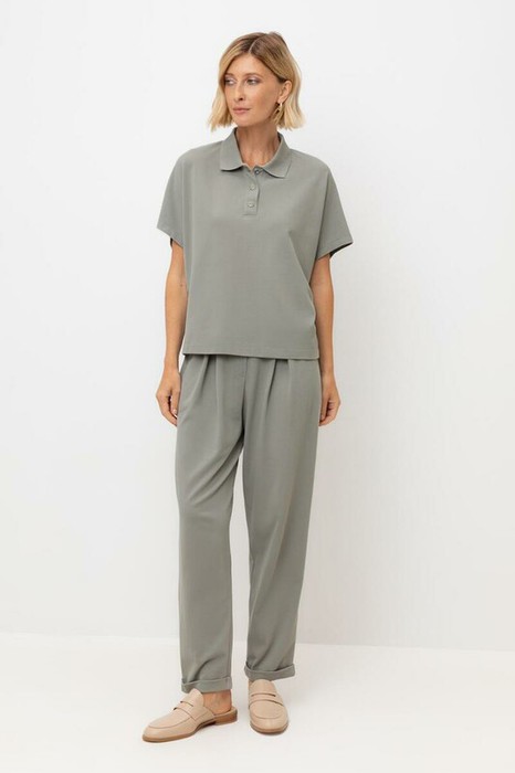 Трикотажные брюки с эластичным поясом, изготовленные из легкого хлопка с рельефной текстурой, дарят ощущение комфорта. Имитация застежки и складки спереди придают изделию свободный силуэт. В сочетании с рубашкой-поло из этой коллекции, вы создадите стильный образ для теплых летних дней.