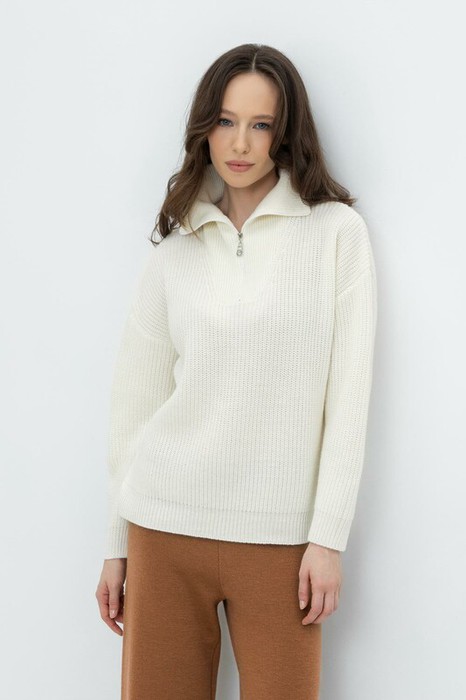 Уютный джемпер в стиле оверсайз со спущенным плечом и объемными рукавами из полушерстяной пряжи. Воротник-стойка застёгивается на молнию.