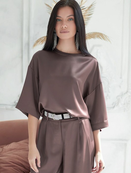 Свободный крой блузки и спущенная линия плеча дарят ощущение легкости и непринужденности, делая образ одновременно женственным и современным. Широкие рукава средней длины гармонично дополняют образ и идеально подходят для полных рук, обеспечивая комфорт, свободу движений и уверенность. Аккуратная застежка на маленькую пуговицу добавляет утонченности, а круглый вырез красиво обрамляет шею, создавая аккуратную линию декольте.