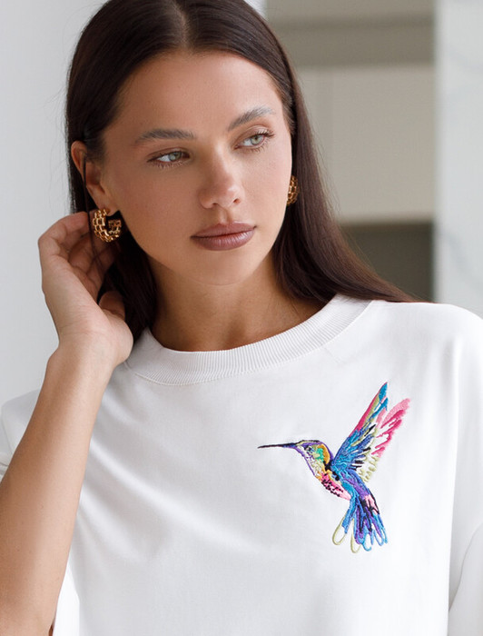 Футболка выполнена из эластичного футера двухнитки. Авторский принт нанесен фактурными красками с устойчивым покрытием. Модель свободного кроя, по низу изделия дополнена хлопковым шнуром с металлической фурнитурой. Изделие сочетается в костюме с шортами D48.010, брюками D44.135 и D44.137