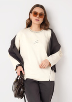 Свитшот выполнен из эластичного футера двухнитки. Изделие дополнили лаконичным принтом стразами в тон изделия. Расслабленный стиль поддерживает спущенная линия плеча, свободный силуэт и разрезы по бокам. Модель сочетается в костюме с брюками D44.135, D44.136, D44.137 и юбкой D46.034