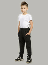 Однотонные брюки для мальчика из футера трехнитки с начесом. Эластичный пояс регулируется по ширине с помощью шнурка. У изделия эластичные манжеты и два кармана по бокам. Брюки сохраняют цвет и форму после многократных стирок.