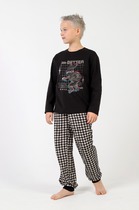 Трикотажная пижама из натурального хлопка. Джемпер с длинными втачными рукавами и брюки с эластичной резинкой в поясе. Мягкие манжеты на рукавах и по низу брюк. Оригинальная набивка выполнена из стойких текстильных гипоаллергенных красителей. Изделие сохраняет цвет и форму после многократных стирок. Все трикотажные полотна производятся в соответсвии с нормами швейцарского сертификата ЭкоТекс.