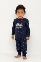 Трикотажный пижамный комплект из футера с начёсом, произведённого из натурального хлопка. У джемпера длинные рукава со спущенными плечами и эластичная мягкая горловина и манжеты. Брюки с удобным поясом на резинке, внизу манжеты. Оригинальная набивка и принт выполнены из стойких, гипоаллергенных текстильных красителей. Все трикотажные полотна производятся в соответствии с нормами Швейцарского сертификата ЭкоТекс.
