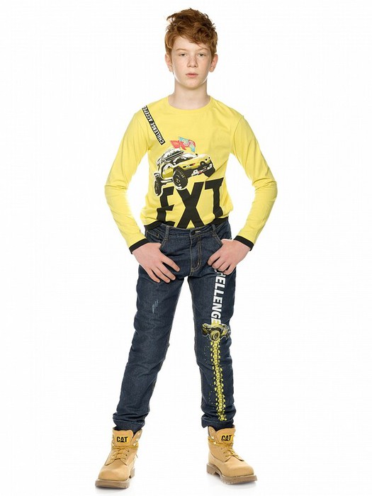 Джинсы для мальчиков на флисе умеренного объёма и отворотами по низу брючин, вертикальный принт Вызов принят.
