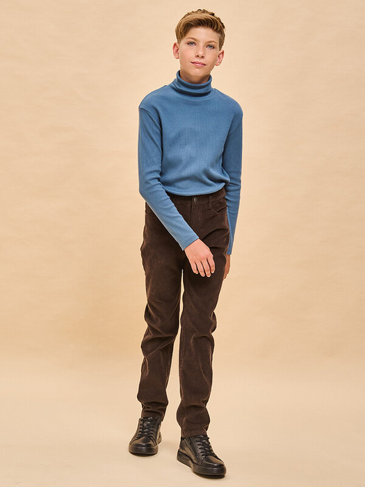 Вельветовые брюки с высокой посадкой для мальчика. Стильная современная модель – идеально сидит, отлично носится, всегда аккуратно выглядит. 100% хлопок в составе – ткань мягкая, дышащая, приятная на ощупь, прочная и простая в уходе. Застежка на гульфик и металлическую пуговицу. Внутренняя регулировка объема по талии широким эластиком и пуговицей – брюки не спадают, комфортно носить без ремня. Удобные карманы по бокам и сзади для важных мелочей. Снизу можно сделать манжеты и отворачивать их по мере роста ребенка. Модель отлично комбинируется с футболкой, водолазкой, лонгсливом – одинаково хорошо с заправленной одеждой и навыпуск. Подходит для создания стильного повседневного образа.