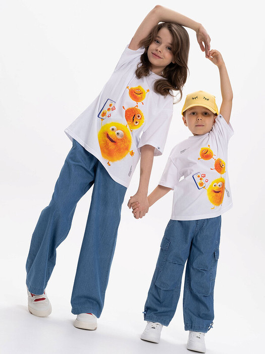 Детская футболка унисекс среднего объема. Прикольная нарядная футболка свободного силуэта со спущенным плечом не будет стеснять движений ребёнка. Вырез горловины отделан эластичной рибаной - голова не застрянет. Главная фишка футболки — яркий милый принт, изображающий персонажа, сгенерированного нейросетью (искусственным интеллектом). Это супермодный тренд! Принт эластичный и стойкий — без проблем переносит многочисленные стирки, не теряя своей яркости. На принте изображён забавный пушистый чудик (монстрик) желтого цвета + надписи "хихиканье", "искры радости для меня" и "создано с помощью искусственного интеллекта". Широкая размерная сетка позволяет приобрести такую футболку как малышу в детский садик так и подростку. . Белые футболки подходят для носки летом, осенью и весной (демисезон), а также зимой .  Цвет товара на экране вашего устройства может отличаться от цвета изделия вживую.