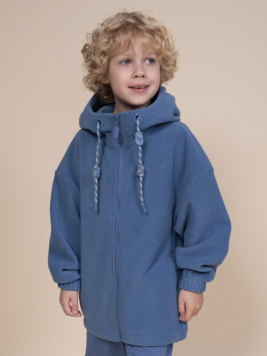 Толстовка для мальчика с капюшоном на застежке молнии. Капюшон с регулировкой на шнурках в крапинку со стопперами. Рукава собраны на широкую внутреннюю резинку. Объм понизурегулируется шнуром со стопперами. Два боковых внутренних кармана.