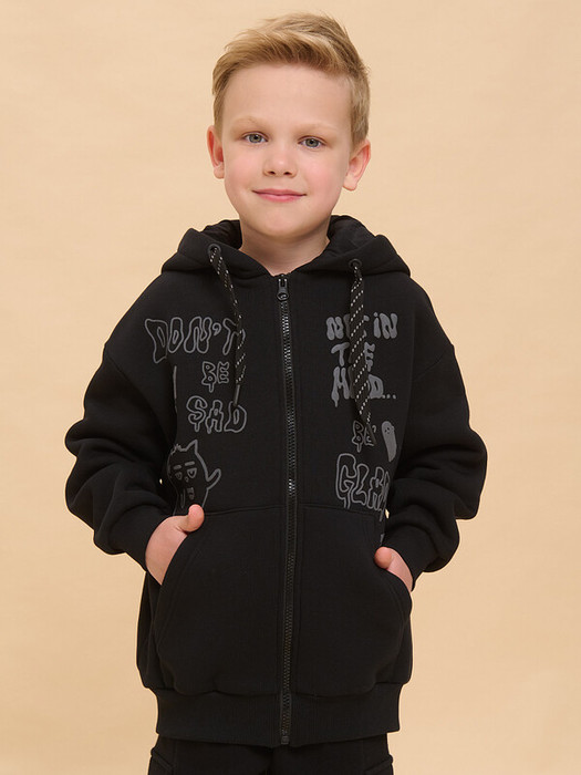 Худи зипка для мальчиков. Трикотажная куртка оверсайз из футера с начёсом заменит ветровку в прохладную погоду. Толстовка детская застёгивается на центральную молнию. В составе ткани преобладает хлопок — зипка мягкая, воздухопроницаемая и очень комфортная. Полиэстер обеспечивает изделию прочность и долговечность. Регулируемый капюшон и манжеты из эластичной рибаны по рукавам и низу защитят от холода и ветра. По переду куртка детская дополнена объёмными накладными карманами. Зипка — базовый элемент для детского и подросткового гардероба. Легко сочетается с джинсами, спортивными брюками и брюками карго. Толстовка для мальчика на молнии декорирована графичными монохромными принтами в готическом стиле по переду. Принты эластичные и стойкие, без проблем переносят частные стирки. Стильная и практичная худи на молнии для мальчика неприхотлива в уходе. Помните о правильном уходе за изделием: рекомендуется стирать при температуре не выше 30 °C, без предварительного замачивания, с изнанки. Это поможет сохранить качество и цвет куртки на длительное время.