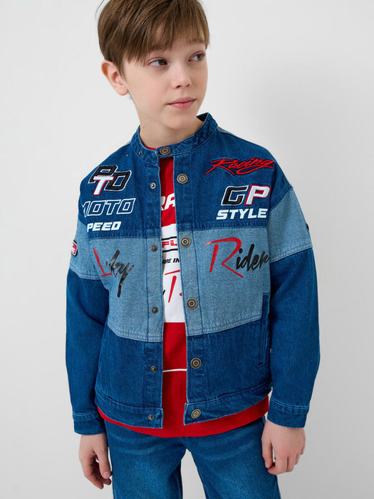 Джинсовая куртка в байкерском стиле, выполнена из плотного тёмно-синего денима с эффектом варки для мальчика подростка. Температурный режим до 15 °C. Модель имеет прямой силуэт и застёжку на кнопках. Два кармана с клапанами на кнопках. Дизайн с декоративными принтами, силиконовыми патчами и текстовыми вставками на спине, рукавах и передней части. Подростковая джинсовка для мальчиков — подойдёт для тёплой весны или ранней осени.