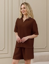 Шорты длинные, свободные из текстильного полотна штапель. По талии притачной пояс со шлевками, по переду гульфик, складки. По спинке вытачки. Спереди металл нашивка на шлевке.