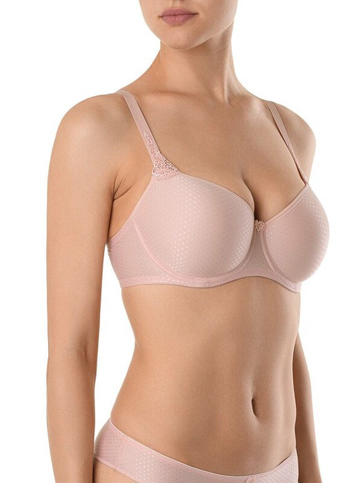 Бюстгальтер серии VOYAGE отличается чистотой линий и исключительным комфортом. Выполненный из полотна с деликатным жаккардовым рисунком «в горошек» и украшенный аппликациями макраме, бюстгальтер поможет создать одновременно простой и утонченный образ. В бюстгальтере используется «дышащий» материал spacer. Преимущества модели:- формованная чашка spacer, на каркасах;- чашка покрыта жаккардовым полотном;- вышитые аппликации макраме. - абсолютный комфорт на протяжении всего дня.
