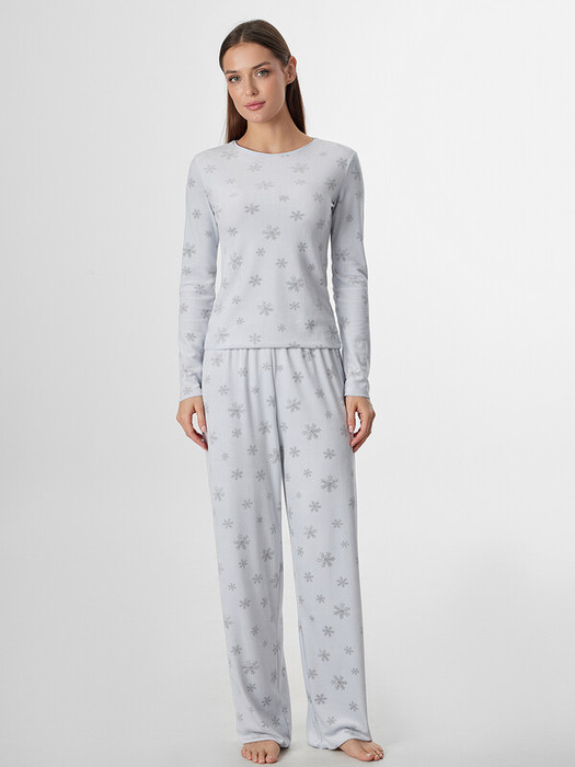Джемпер с круглым вырезом и длинными рукавами мягко облегает фигуру, не стесняя движений. Брюки со средней посадкой на мягком эластичном поясе обеспечивают комфорт и удобную посадку. Два вместительных кармана в боковых швах с мягкой подкладкой внутри добавляют модели практичности.