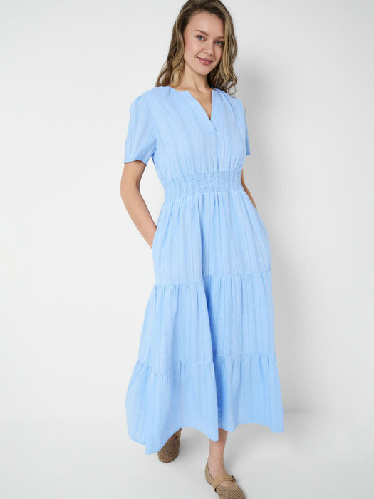 Женское летнее платье в длине миди. Модель имеет широкую резинку по талии. Верхняя часть дополнена подкладкой для комфорта. Хлопковая ткань с тонким фактурным рисунком и цветочными элементами придаёт изделию нежный и воздушный вид. V-образный вырез делает образ более выразительным.