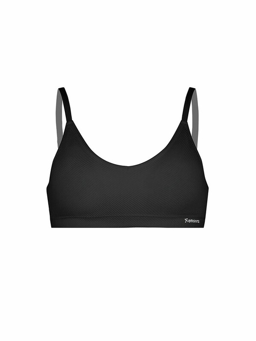 Бюстгальтер-топ из эластичного рибового полотна в косой рубчик с мягким подкладом и  съемными вкладышами.  Без каркасов и боковых корсетных вставок. Регулируемые не съемные тонкие бретели.. Брендированная лента под грудью.