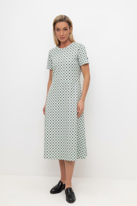 Платье с короткими рукавами из плотного набивного трикотажа интерлок . Модель с трапициевидной юбкой и боковыми карманами.