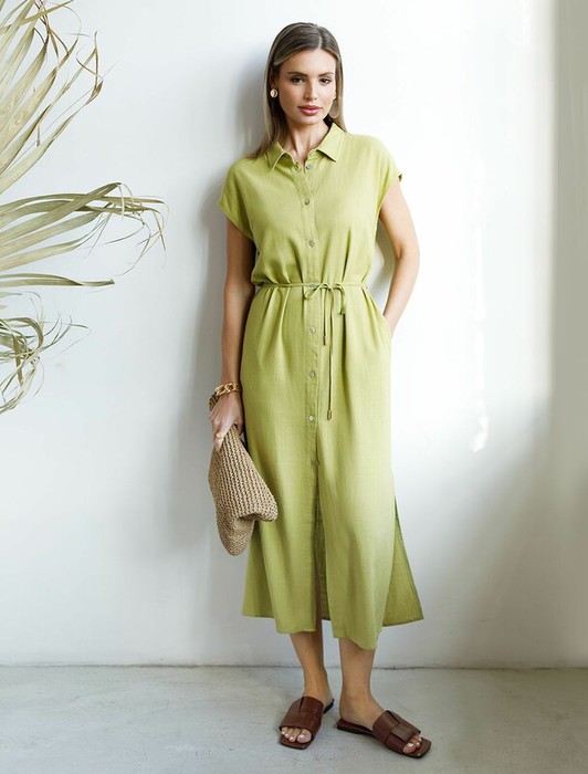 Платье-рубашка салатового цвета выполнено из натурального льна и вискозы, плотностью 200 Г/м2. Сочетание льна и вискозы обеспечивает комфорт и прохладу в жаркие дни. Это свободное платье на пуговицах по всей длине будет идеальным выбором для лета и весны. Благодаря качественному составу ткани, платье отлично держит форму, не сковывает движения и отличается износостойкостью. Отложной воротник добавляет классический акцент, удобный пояс подчеркивает талию, делая силуэт выразительным и женственным. Платье с коротким цельнокроеным рукавом смотрится современно, а высокие разрезы по бокам добавляют легкости и динамики образу. Подойдет на большие размеры, скроет возможные недостатки и подчеркнет достоинства фигуры. На высокий рост платье будет длины миди, а на низкий рост - длина макси. Такое красивое и легкое платье подойдет для работы, городской прогулки и повседневного стиля.