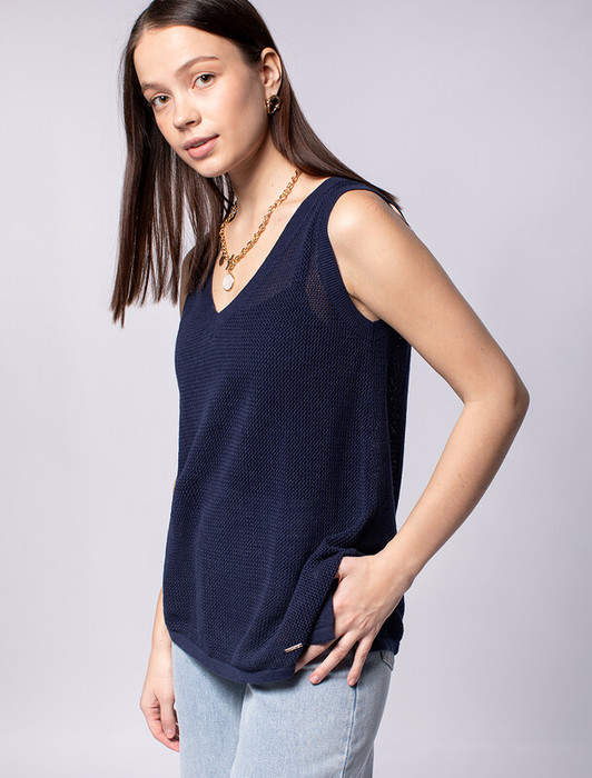 Совместные покупки Пермь Женская одежда Джемперы, свитеры, водолазки — 21.04 Vilatte Летний топ полупрозрачной вязки из хлопка D33.010 темно-синий