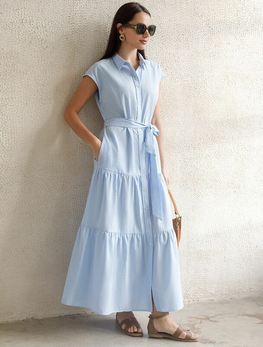 Платье А-силуэта с поясом фисташкового цвета выполнено из легкого хлопкового поплина плотностью 123 Г/м2. Воздушное платье на пуговицах по всей длине с пышной юбкой-воланами в стиле бохо отличный вариант для теплой и жаркой погоды. Модель обладает красивым ярусным кроем, который придает образу женственность и элегантность. Отложной воротничок и короткий рукав создают стильный акцент, подходящий для повседневного ношения и различных ситуаций. Талия подчеркнута поясом, который легко регулируется и подчеркивает силуэт, придавая особый шарм и аккуратность образу. Натуральный состав ткани обладает высокой воздухопроницаемостью, а также способностью поглощать и отдавать влагу. В повседневном платье будет очень комфортно, благодаря правильной регуляции температуры тела. Такая модель подходит на маленький и высокий рост, а так же на любую фигуру, позволяя подчеркнуть достоинства и скрыть возможные недостатки. Это длинное платье отлично подойдет тем, кто ценит удобство и утонченность в одежде из качественной вискозы